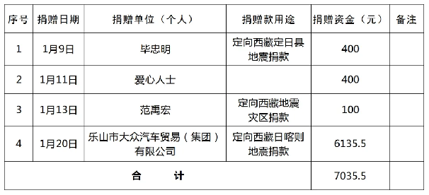 2025年1月1日0时至2025年1月31日24时,乐山市红十字会本级累计收到4笔捐赠资金共计7035.5元(大写:柒仟零叁拾伍元伍角整)。在此,特向社会各界的爱心善举表示衷心的感谢!