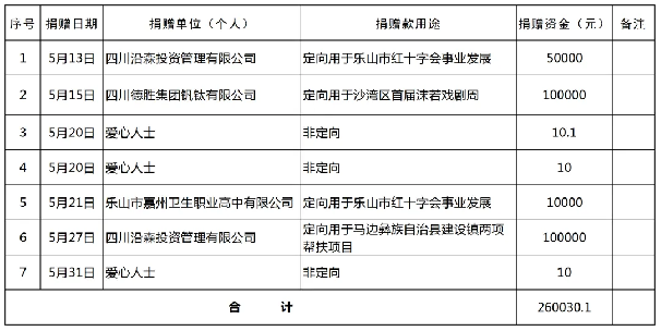 2025年5月1日至2025年5月31日24时,乐山市红十字会本级累计收到7笔捐赠资金共计260030.1元(大写:贰拾陆万零叁拾元壹角整)。在此,特向社会各界的爱心善举表示衷心的感谢!