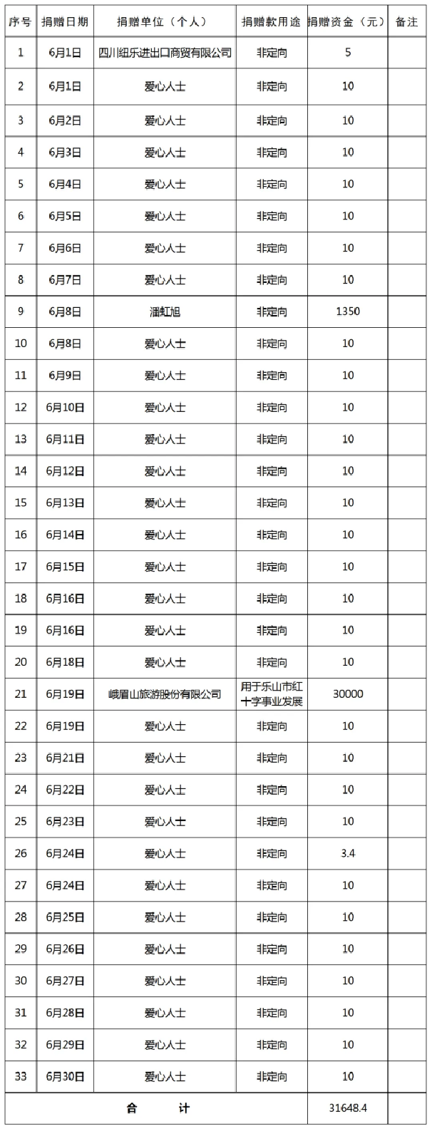 2025年6月1日0时至2025年6月30日24时,乐山市红十字会本级累计收到7笔捐赠资金共计31648.4元(大写:叁万壹仟陆佰肆拾捌元肆角整)。在此,特向社会各界的爱心善举表示衷心的感谢!