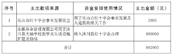 2024年6月1日0时至2024年6月30日24时,乐山市红十字会本级累计支出捐赠资金802905元。在此特向社会各界的爱心善举表示衷心的感谢!按照公开、透明、高效的原则,现将捐赠资金支出情况公示如下,欢迎社会各界监督。