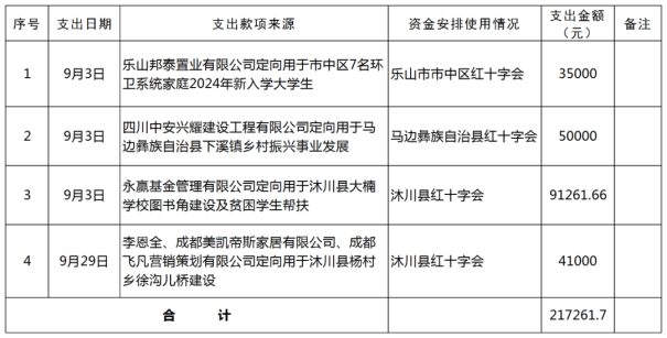 2024年9月1日0时至2024年9月30日24时,乐山市红十字会本级累计支出4笔捐赠资金共计217261.66元(大写:贰拾壹万柒仟贰佰陆拾壹元陆角陆分)。按照公开、透明、高效的原则,现将捐赠资金支出情况公示如下,欢迎社会各界监督。在此,也特向社会各界的爱心善举表示衷心的感谢!