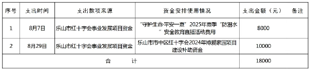 2025年8月1日0时至2025年8月31日24时,乐山市红十字会本级累计支出2笔捐赠资金共计18000元(大写:壹万捌仟元整)。按照公开、透明、高效的原则,现将捐赠资金支出情况公示如下,欢迎社会各界监督。在此,也特向社会各界的爱心善举表示衷心的感谢。