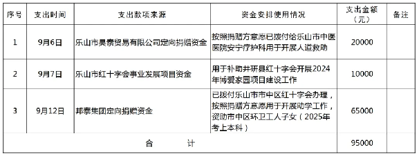 2025年9月1日0时至2025年9月30日24时,乐山市红十字会本级累计支出3笔捐赠资金共计95000元(大写:玖万伍仟元整)。按照公开、透明、高效的原则,现将捐赠资金支出情况公示如下,欢迎社会各界监督。在此,也特向社会各界的爱心善举表示衷心的感谢!