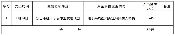 2026年1月1日0时至2026年1月31日24时,乐山市红十字会本级累计支出1笔捐赠资金共计3245元(大写:叁仟贰佰肆拾伍元整)。
