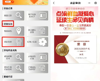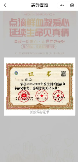 03查看证书:在界面找到"献血服务"→点击“表彰查询”→点击查看证书。