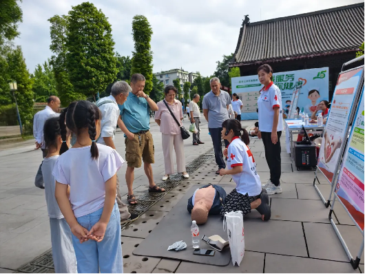 犍为县红十字会特色活动——“应急救护广场风景线”如约而至。红十字救护师资在文庙广场摆上摊位,开展“不卖货、只授课”的公益活动。