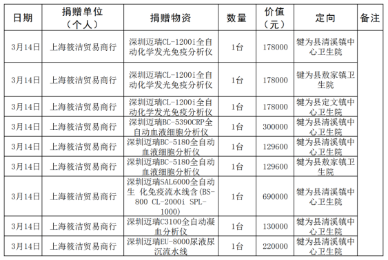 乐山市红十字会关于社会捐赠物资接收使用情况的公示(2023年第3期)(关键词:筱洁贸易、分析仪)