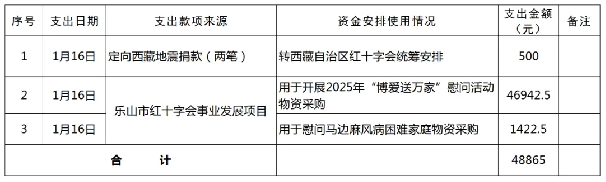 2025年1月1日0时至2025年1月31日24时,乐山市红十字会本级累计支出3笔捐赠资金共计48865元(大写:肆万捌仟捌佰陆拾伍元整)。按照公开、透明、高效的原则,现将捐赠资金支出情况公示如下,欢迎社会各界监督。在此,也特向社会各界的爱心善举表示衷心的感谢!