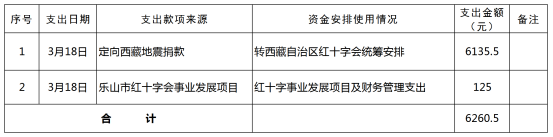 2025年3月1日0时至2025年3月31日24时,乐山市红十字会本级累计支出2笔捐赠资金共计6260.5元(大写:陆仟贰佰陆拾元伍角整)。