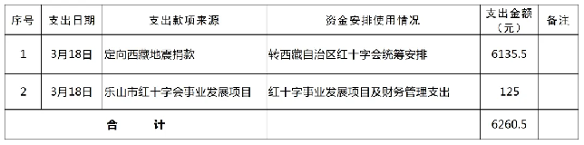 2025年2月1日0时至2025年3月18日24时,乐山市红十字会本级累计支出2笔捐赠资金共计6260.5元(大写:陆仟贰佰陆拾元伍角整)。