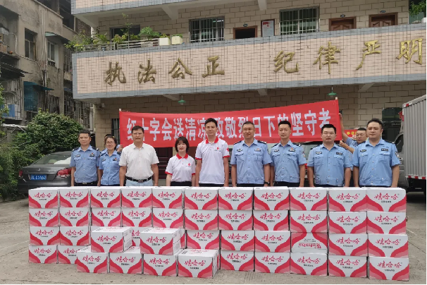 7月2日,犍为县红十字会筹集160箱纯净水到县交警大队、县环卫所等单位开展“夏季送清凉”活动,对在高温下坚守岗位的交警、环卫工人等表达深切问候,并叮嘱他们在工作中做好防暑降温措施。
