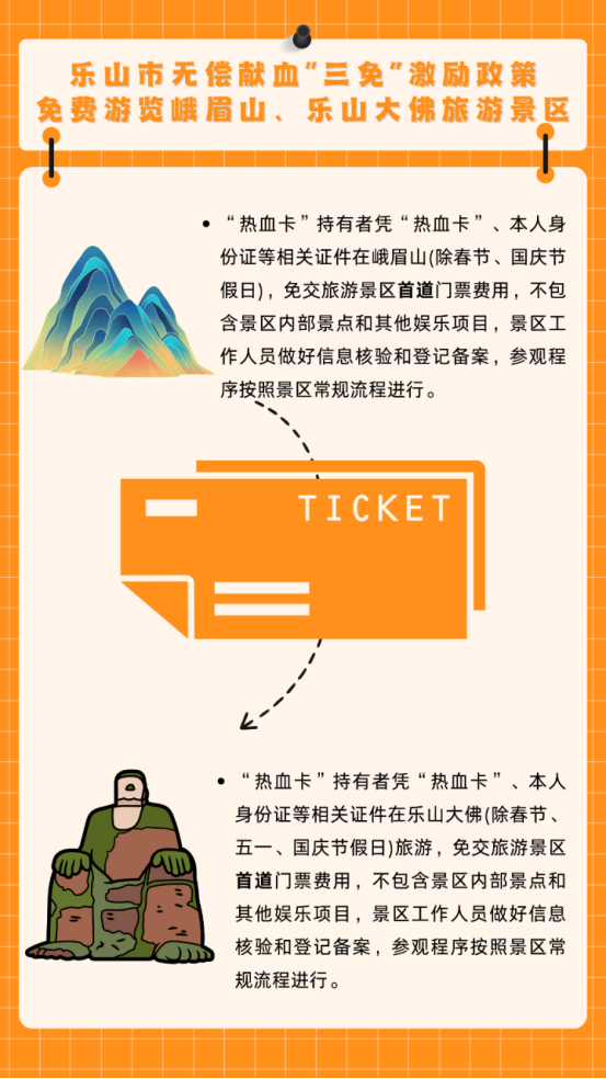 (二)免费游览峨眉山、乐山大佛旅游景区。“热血卡”持有者凭“热血卡”、本人身份证等相关证件在峨眉山(除春节、国庆节假日)、乐山大佛(除春节、五一、国庆节假日)旅游,免交旅游景区首道门票费用,不包含景区内部景点和其他娱乐项目,景区工作人员做好信息核验和登记备案,参观程序按照景区常规流程进行。