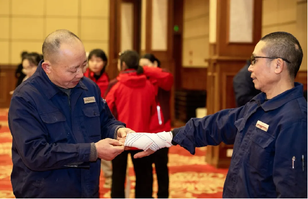 实操演练环节,培训现场设置心肺复苏模拟人、创伤包扎模型、AED教学设备等实操区域,学员们在授课老师的指导下,逐一进行实操练习。在心肺复苏实操区,学员们按照“评估环境—判断意识—呼救报警—胸外按压—开放气道—人工呼吸”的标准流程反复练习;在创伤包扎区,针对酒店服务中可能遇到的擦伤、割伤、骨折等情况,学员们认真练习环形包扎、螺旋包扎、三角巾固定等常用技能,授课老师还结合不同创伤部位的包扎难点,进行个性化指导;在AED实操区,学员们模拟真实应急场景,完成了从设备取出、开机操作到电极片粘贴、配合心肺复苏的全流程演练。