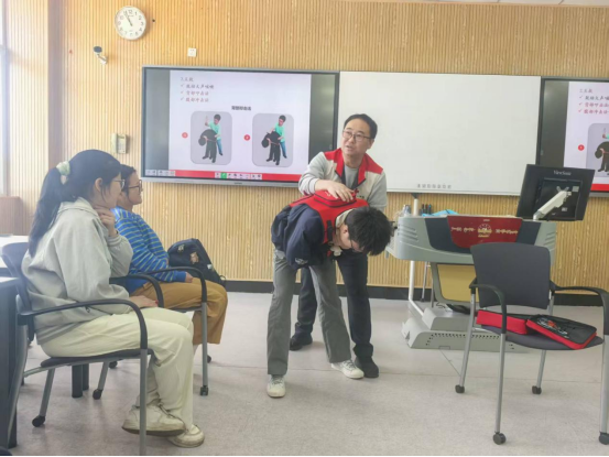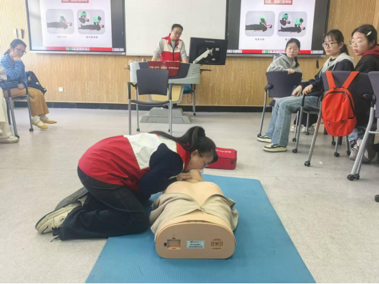 此次培训邀请到红十字应急救护师资郭林、范学科进行现场授课。培训采用“理论讲解+实操演练+考核验收”的沉浸式教学模式,内容紧扣校园生活实际需求。郭林结合真实案例,深入浅出讲解了应急救护概论、红十字运动知识,重点围绕心肺复苏(CPR)、自动体外除颤器(AED)使用、气道异物梗阻急救(海姆立克法)、创伤止血包扎、骨折固定等核心技能展开教学。
